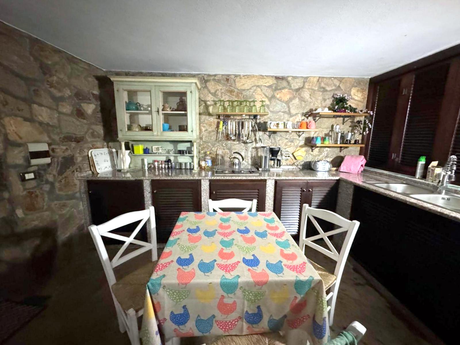 Neben einem schönen Gasherd mit 4 Flammen, einer Küchenspüle sowie einem Kühlschrank, steht hier auch ein großer steinerner Grill. Die Küche kann mit einem elektrischen transparenten Rollo komplett verschlossen werden.
